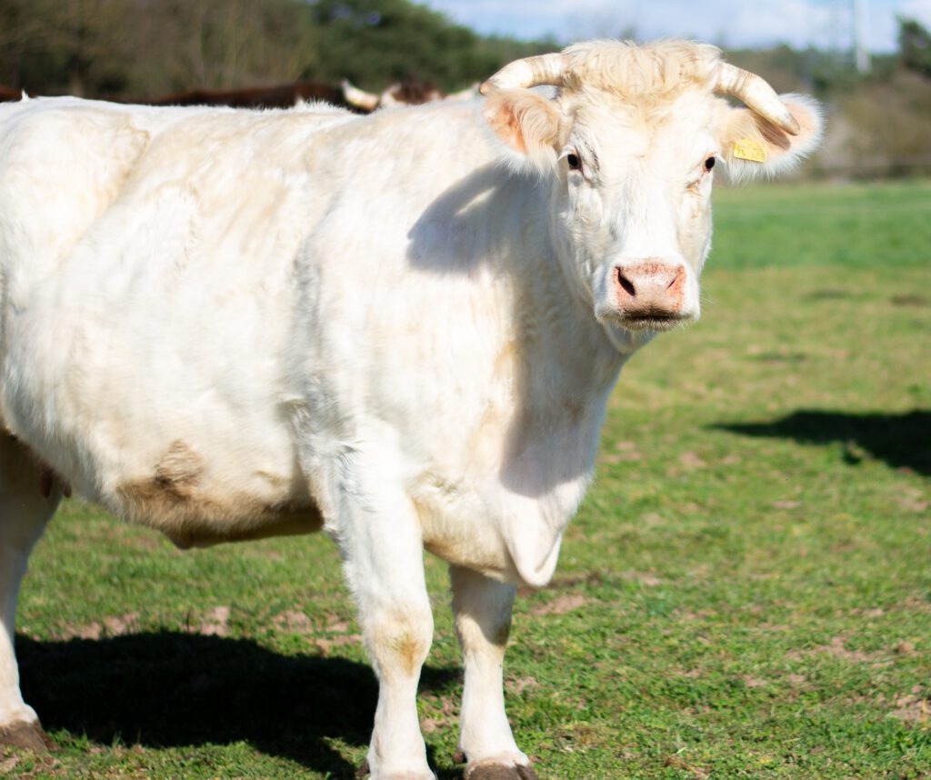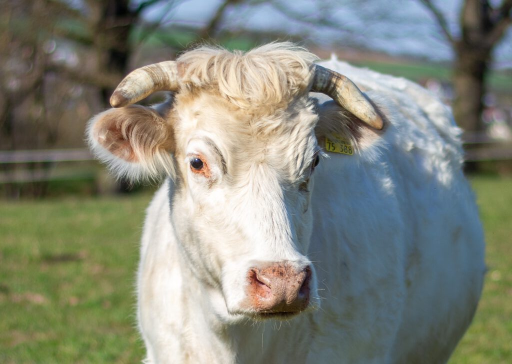 Das ist die märchenhafte Schneewaltraud, die am 28. April 2016 geboren. Sie ist schneeweiß und ganz vorsichtig gegenüber Menschen. Sie ist eine französische Charolais Kuh. Sie zog Kälber auf und leitete die Herde. Als ihr eigener Sohn der Deckbulle der Herde werden sollte, musste sie die Herde verlassen, um Inzucht zu vermeiden. Ihr Landwirt suchte ein neues Zuhause für sie, aber niemand wollte sie haben, weil sie behornt ist. Es blieb nur noch der Weg zum Schlachter. Doch das wollte der Landwirt nicht und vertraute und Schneewaltraud an. Seit dem Winter 2021 ist sie eine Lebenskuh.