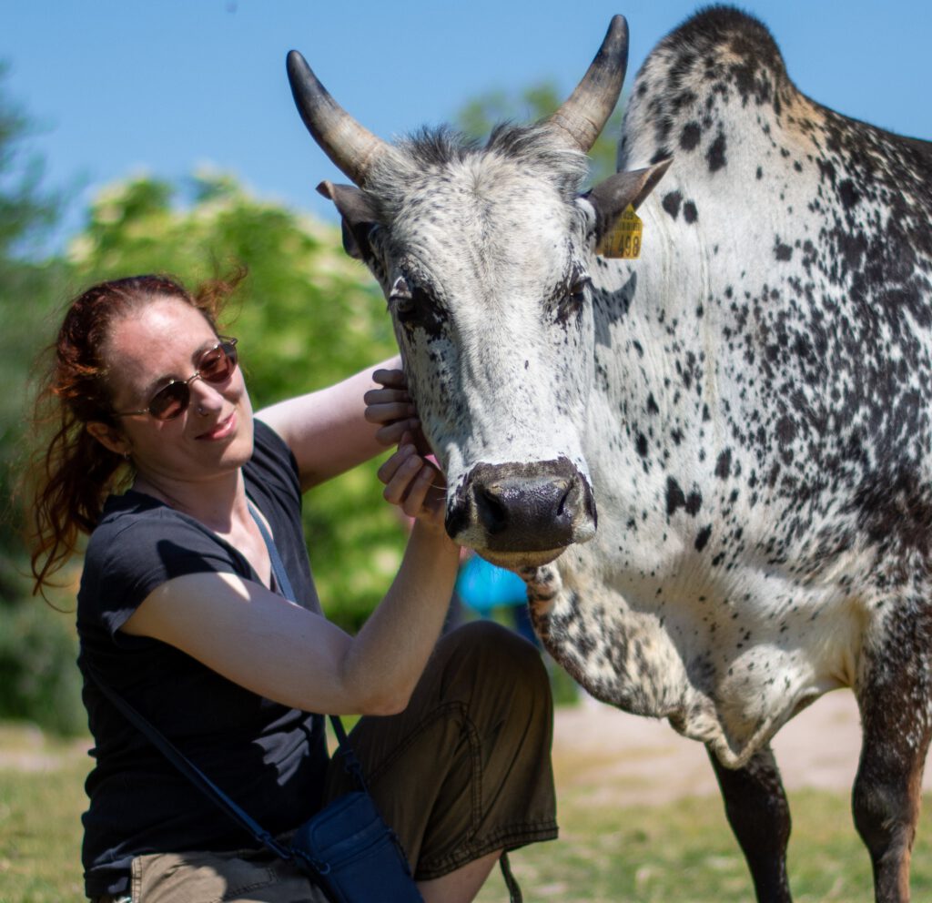 Andrea fühlte sich schon während ihrer Kindheit den Tieren sehr verbunden und ist mit verschiedenen Haustieren aufgewachsen. Durch eine befreundete Bauernfamilie, hatte sie damals schon erste Kuhkontakte und verbrachte viel Zeit im Kuhstall.Später im Erwachsenenalter sehnte sich Andrea nach jahrelanger Arbeit im Bereich der Frühgeborenen Intensivpflege nach einer Auszeit. Ihre Liebe zur Natur und Tieren und das Bedürnis nach Ruhe waren der Antrieb, mehrere Almsommer über Rinder auf der verschiedenen Almen in Oberbayern zu hüten. Während dieser Zeit ist eine enge Verbundenheit und tiefe Liebe zu diesen wunderbaren Tieren entstanden. Mit Lotte und Bubi hat Andrea mittlerweile selbst zwei Rinder adoptiert und eine ganz enge Beziehung zu den beiden.Andrea betrachtet sich als ‚Kuhbotschafterin‘ und somit liegt es ihr besonders am Herzen, Menschen mit Rindern in Kontakt zu bringen und deren vielfältige Eigenschaften deutlich zu machen.